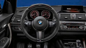 Alcantara je skvělý materiál pro sportovní volanty: zaručuje dokonalý grip i v extrémních jízdních situacích. Volant má uprostřed atraktivní dekor z lakovaných uhlíkových vláken. Sportovní design s ručně šitým křížovým švem ve stříbrno-šedé barvě dokonale ladí se vzhledem M Performance. K dispozici pro řadu modelů BMW.
